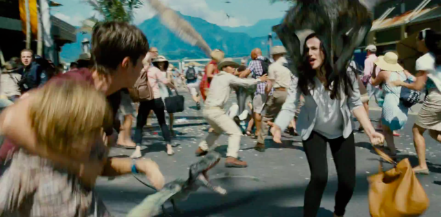 But the killing of the biggest douche (evil military dude) of the movie is actually not the most elaborate death. That distinction belongs to Zara, Claire’s British personal assistant who gets deputized into being a babysitter for the nephews. Zara is pretty disinterested in that particular job (and, dude, who can blame her – the younger kid, Gray, is nice, but that older one, Zach, is kind of a dick for the first chunk of the film), but it really isn’t her fault when Zach makes the executive decision for the pair of them to run away from their minder and go into the main park. Offscreen, she then makes spends a large chunk of the film attempting to locate the boys (very poorly, since the boys should’ve been easily trackable by their wristbands, and stopped the first time they attempted to get on a ride, but the park is clearly run by idiots, so fine). She is reunited with the boys offscreen, and is running in their general vicinity again as the entire park gets menaced by pterodactyls. Her death occurs as she is grabbed by a pterodactyl, which then flies her over into the aquarium tank, dunks her, lifts her out, dunks her again in some pretty uncomfortable drowning behavior, then lifts her out again, then both Zara and the pterodactyl are eaten by the giant aquatic dinosaur. It actually sticks out as fairly cruel.