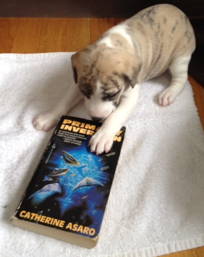 If there does end up being a Puppy #5, then it will be named (regardless of gender!) Reynolds — not for Mal of Firefly, but for Alastair Reynolds, because in my brother’s words about his book Pushing Ice, “Long journeys are the best journeys.” Let’s hope so, Possible Puppy #5! (I had the pleasure of being on a panel with Alastair Reynolds at Worldcon, and he is such an amazingly nice guy that I really hope he will not be INCREDIBLY CREEPED OUT by having Possible Puppy #5 named in his honor. I feel like Scalzi can accept this canine naming tribute in the spirit to which it is offered, and I have no basis to make a guess regarding Asaro, Tepper, and Brin, so I’m going to figure that what they won’t know certainly won’t hurt them).
