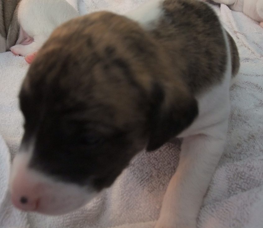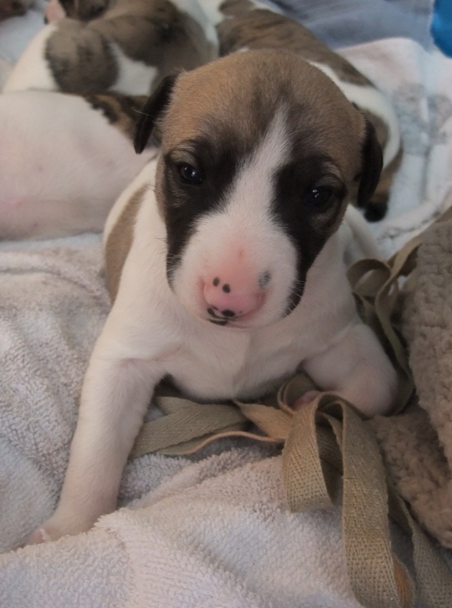Since the litter is half the size of a usual whippet whelping (say that ten times fast), the puppies don’t have to fight too hard for their meals, so they seem to be growing like a science experiment gone awry. I first saw them when they were two days old, and at that time they could lie in one hand. Now they are about the size of guinea pigs, and they require two hands to cuddle, due to all the puppy fat. Seriously, these puppies are so fat that they can barely lift themselves up. The only one who can maneuver with any kind of real agility (and even that is really being graded on a curve) is Scalzi, because Scalzi is the smallest puppy right now. By smallest I mostly mean “least fat.”