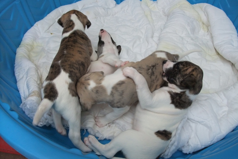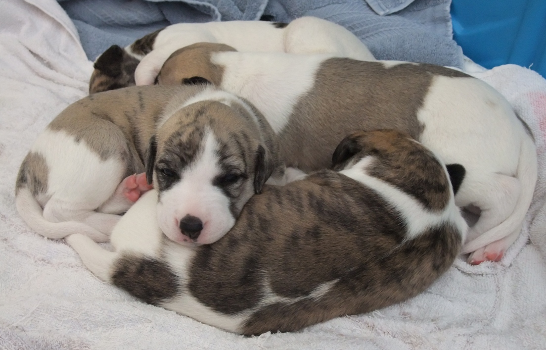 The puppies continue to grow. With their mother as a convenient size reference, observe their terrifying growth rate. There’s starting to be a concern that these puppies are the whippet versions of Babe the Blue Ox. And we all know how that ended – in tragedy and a year’s worth of steak.
