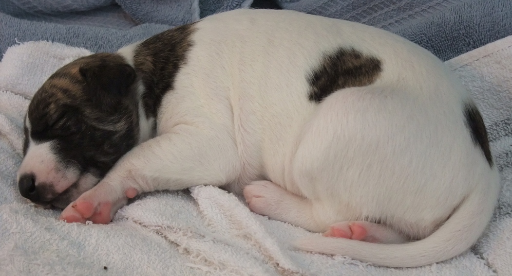 At the far left, and the first puppy born (and the one who looks most like Jessie in her coat pattern) is Asaro (named of course for Catherine Asaro, physicist and author of the amazing Saga of the Skolian Empire series). At the far right with the really funny spot pattern is Scalzi (named for John Scalzi, whose Old Man’s War series my brother and I both really love).