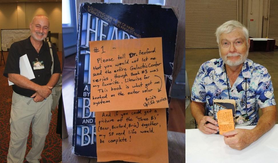See? That’s Gregory Benford holding my brother’s book post-signature, and that’s David Brin *thinking* about my brother’s book. Or, you know, space. Or cheese.