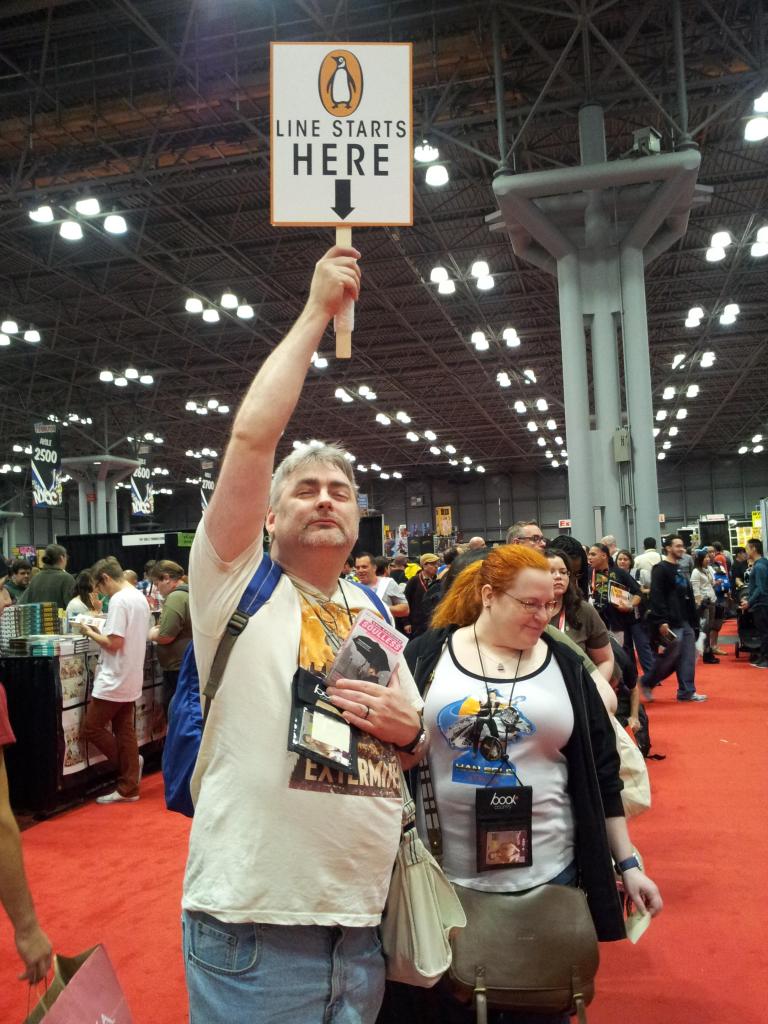 Then there’s the best part of the con – meeting people! I got to meet up with lots of people who I’d already met at other cons, plus lots of new people! It was fantastic. The first thing I got to do was at the Penguin booth, where Myke Cole, Benedict Jacka, and I were signing copies of our books. Now, I thought that this meant that we’d be kind of hand-selling a little, maybe meeting some people who had brought their copies. Oh no – that’s not how Penguin rolls. The first hundred people who lined up at the booth got free copies of each of our books, that we would then sign. It was SO COOL.